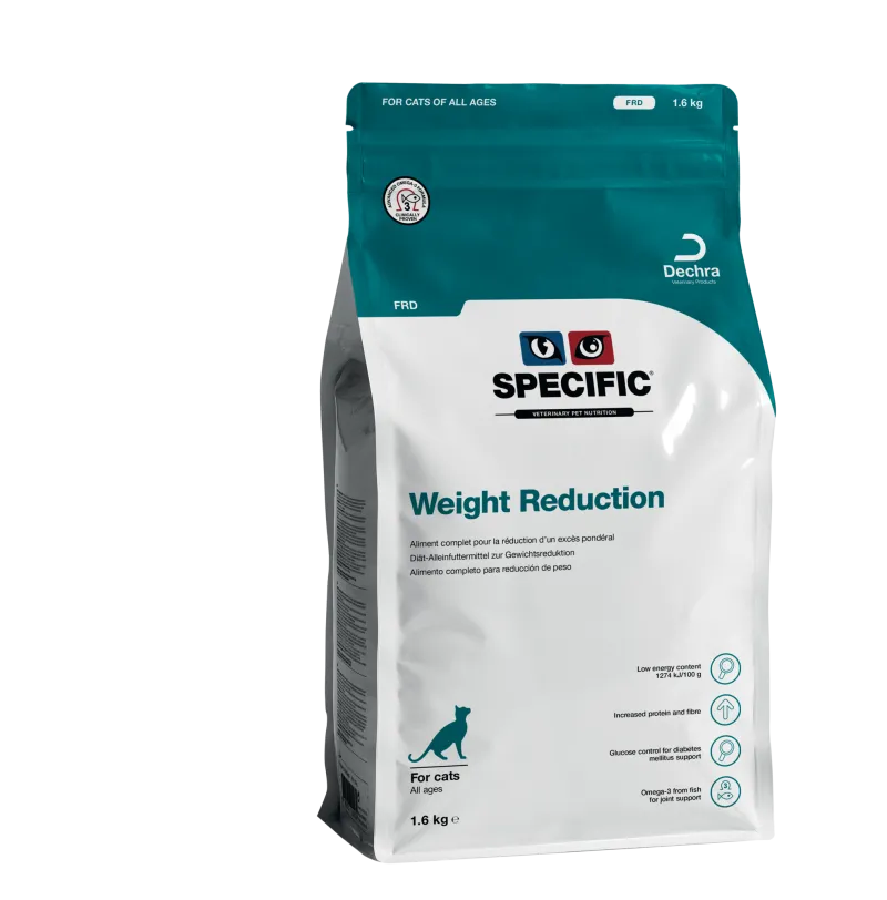 Svorio mažinimo etapo metu rekomenduojama duoti tik 65% normaliai katei rekomenduojamo SPECIFIC™ FRD Weight Reduction kiekio. Jei katės svoris nekris, gali tekti dar labiau sumažinti ėdalo dienos normą. Jei katė nutukusi, reikia vengti badavimo arba pagreitinto svorio metimo, nes tai gali sukelti kepenų lipidozę. Individualūs kasdieniai poreikiai gali skirtis, priklausomai nuo veislės, aplinkos, sezono, fizinio krūvio ir kitų panašių veiksnių. Taigi, rekomenduojama nuolat stebėti gyvūno būklę ir svorį, pagal tai reguliuojant ėdalo kiekį.