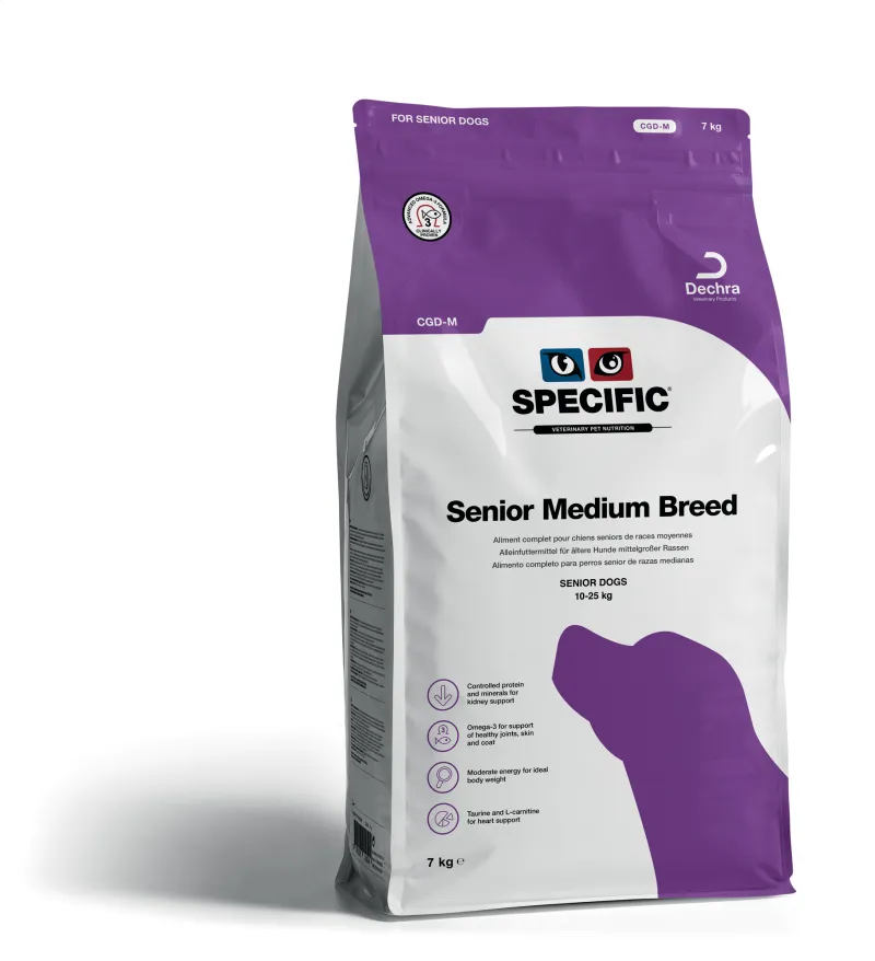 Kasdienis ėdalas senyviems vidutinio dydžio veislių šunims nuo 7 metų amžiaus. SPECIFIC™ CGD-M Senior Medium Breed – ėdalas, padedantis sulėtinti senatvinių ligų progresavimą arba jų išvengti.